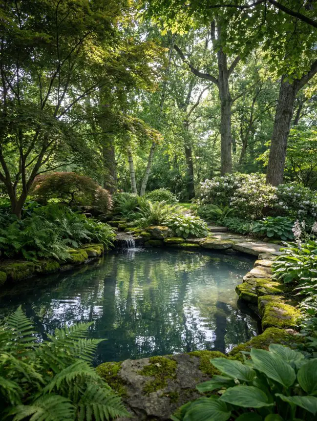 Moss-covered stones give a pond an aged, enchanted appearance. Over time, moss softens hard edges and creates a natural, storybook-like setting. This design thrives in shaded or partially shaded gardens and pairs beautifully with ferns and woodland plants. The result is a tranquil, timeless pond that feels quietly magical and deeply connected to nature.