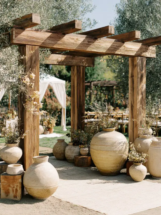 Nature-inspired ground décor completes the boho pergola look by blending the structure into its surroundings. Potted grasses, dried floral baskets, clay pots, or woven planters placed at the base add depth and softness. This grounding approach creates a seamless transition between the pergola and the landscape, enhancing the organic, free-spirited feel of a boho wedding ceremony.