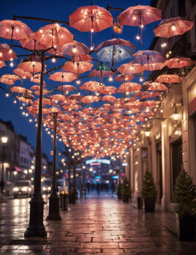 Hang open umbrellas upside down from the light poles and decorate them with lights and ornaments. This creates a whimsical canopy effect above the street.