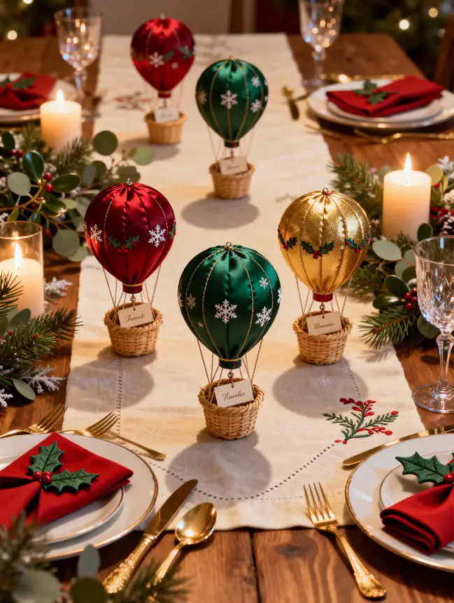 Elevate your holiday dining table with charming hot air balloon–themed place settings. Use miniature balloon ornaments or handcrafted paper balloons as decorative place card holders. Attach guests’ names to tiny baskets or cloud-shaped tags beneath each balloon. Pair the setup with coordinating napkins, soft candlelight, and winter greenery. This thoughtful detail creates a whimsical, sky-themed dining experience that instantly delights guests and ties beautifully into your festive décor.
