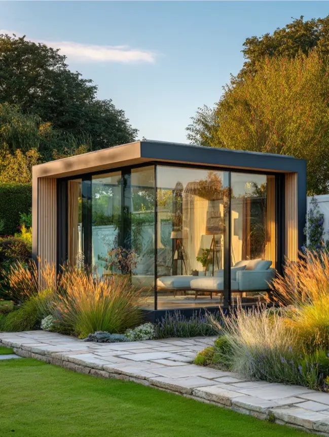 A modern greenhouse-style garden house blends transparency with structure using metal frames and clear glass panels. Unlike traditional greenhouses, this design incorporates insulation, flooring, and seating to make it livable year-round. It’s perfect for plant lovers who want a hybrid space for growing greenery and relaxing. The result is a bright, stylish retreat that feels fresh, modern, and connected to nature.