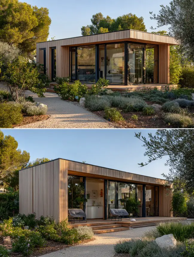 A modular garden house is built using prefabricated sections that can be expanded or rearranged over time. This design is ideal for evolving needs, allowing homeowners to add rooms or functions later. Clean lines, uniform materials, and efficient construction make it both modern and cost-effective. It’s a future-proof solution for flexible outdoor living.