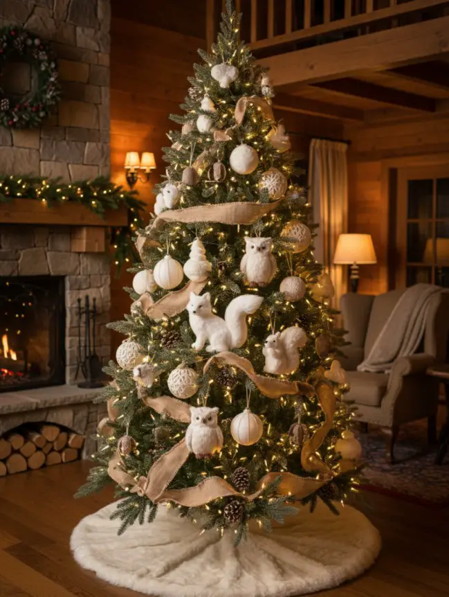 Faux fur and plush accents add soft, cozy warmth to your rustic Christmas tree. Choose ornaments in neutral tones like ivory, beige, or gray to mimic the comfort of a winter cabin. Plush stars, fur-wrapped baubles, or fluffy animal ornaments bring texture and a gentle, inviting feel. These elements balance the roughness of wood, burlap, and pinecones, creating a charming blend of comfort and rustic elegance.