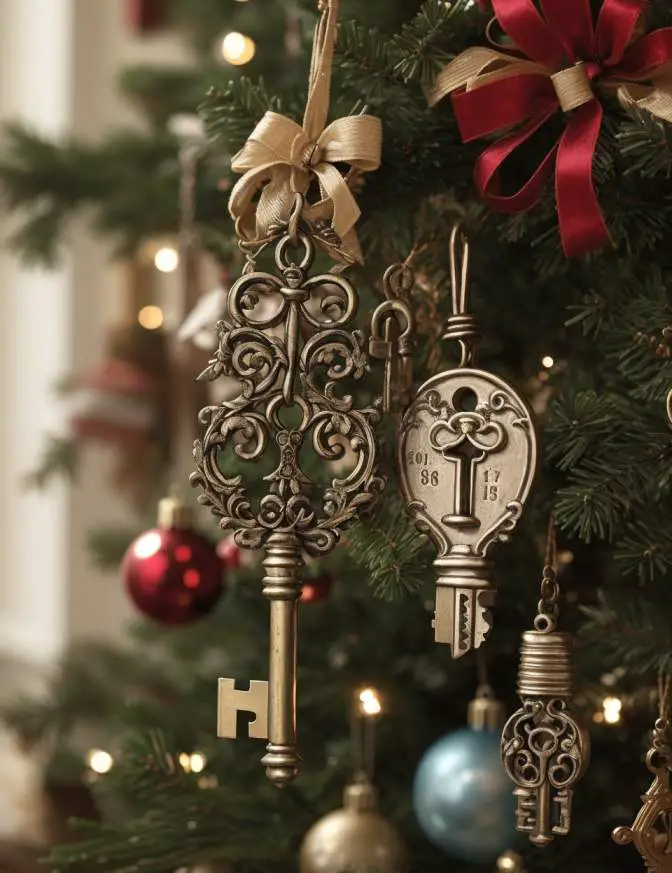 Antique keys make unique and charming rustic ornaments for your Christmas tree. Their aged metal finish, vintage shapes, and worn patina add a sense of history and mystery to your décor. Tie them with jute twine or plaid ribbon for a farmhouse touch. These simple yet elegant accents pair beautifully with wood, burlap, and warm lights, giving your tree an old-world, story-rich holiday charm.