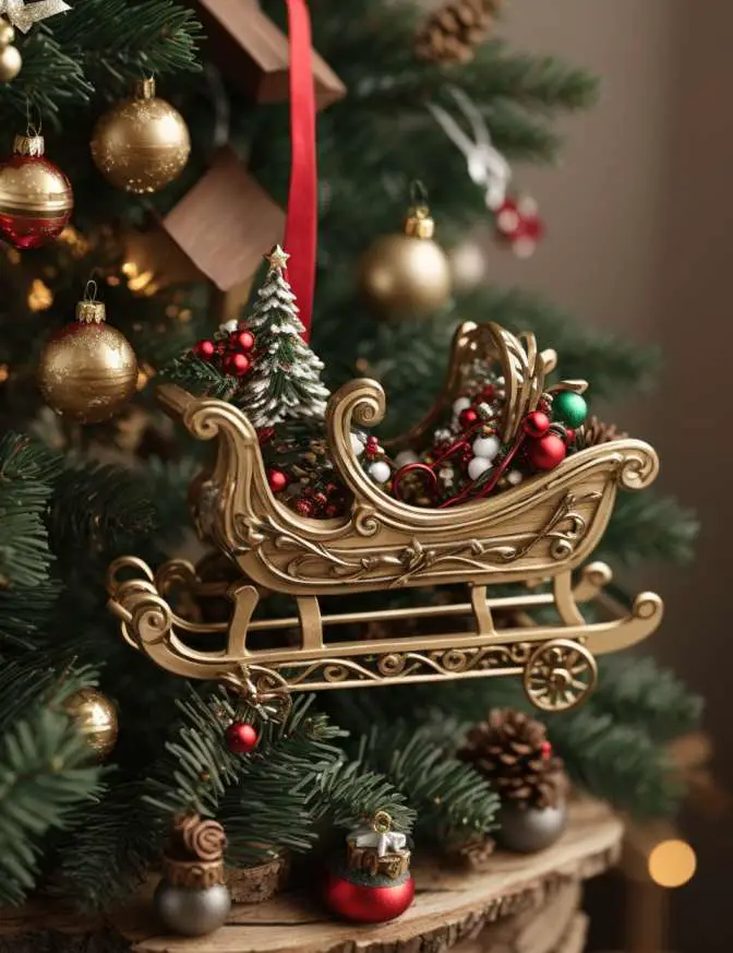 Sleigh ornaments bring a nostalgic, storybook charm to your rustic Christmas tree. Crafted from wood, metal, or distressed finishes, these tiny sleds add movement and whimsy to your décor. Their vintage look pairs beautifully with pinecones, plaid ribbons, and warm lights. Whether simple or detailed, sleigh ornaments evoke childhood memories and create a cozy, old-fashioned holiday atmosphere filled with warmth and rustic beauty.